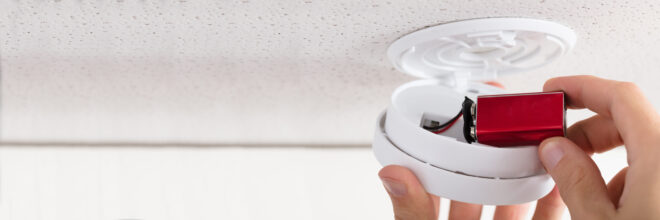 HOME > 新着情報 > Person’s Hand Inserting Battery In Smoke Detector
